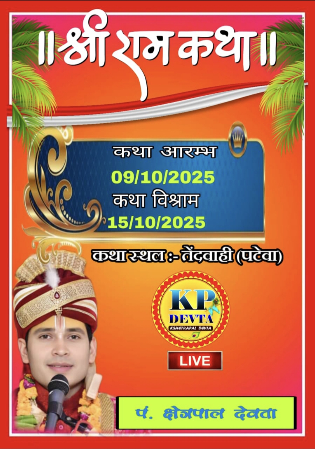 आयोजन समिति ने क्षेत्र के सभी धर्म प्रेमी बंधुओं से अपील की है कि वे सपरिवार इस पुण्य कथा का श्रवण कर धर्म लाभ प्राप्त करें और अपने जीवन को सफल बनाएं। कथा का सीधा प्रसारण (LIVE) भी किया जाएगा, जिसकी विस्तृत जानकारी ‘KP Devta’ और अन्य सोशल मीडिया प्लेटफॉर्म पर उपलब्ध होगी।