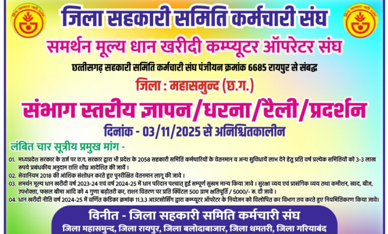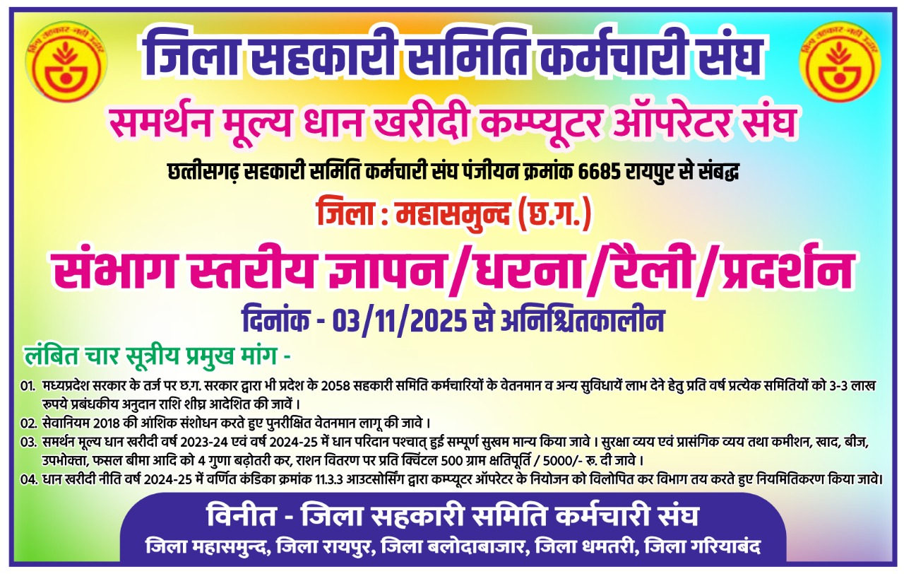 महासमुंद (छत्तीसगढ़)। आगामी धान खरीदी सत्र से ठीक पहले, छत्तीसगढ़ में जिला सहकारी समिति कर्मचारी संघ और समर्थन मूल्य धान खरीदी कंप्यूटर ऑपरेटर संघ ने अपनी चार सूत्रीय लंबित मांगों को लेकर संभाग स्तरीय ज्ञापन, धरना, रैली और प्रदर्शन की घोषणा की है। यह आंदोलन दिनांक 03/11/2025 से अनिश्चितकालीन होगा, जिससे राज्य में धान खरीदी सहित सहकारिता से जुड़े अन्य कार्य बुरी तरह प्रभावित होने की आशंका है।