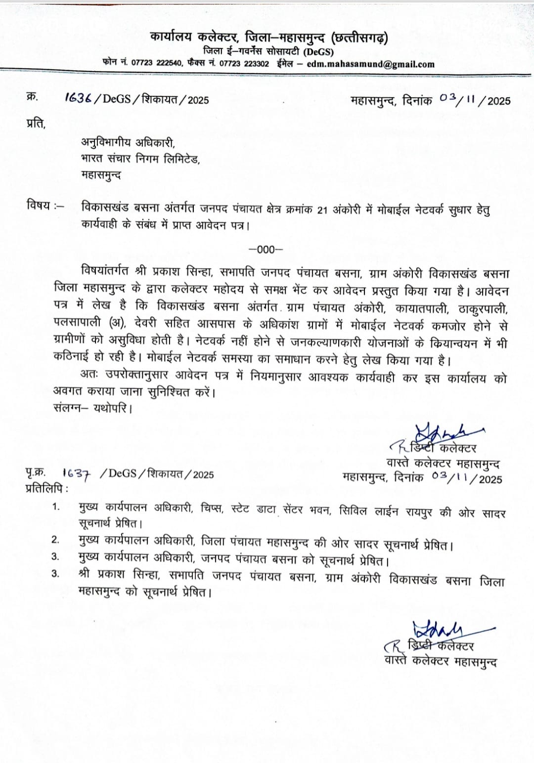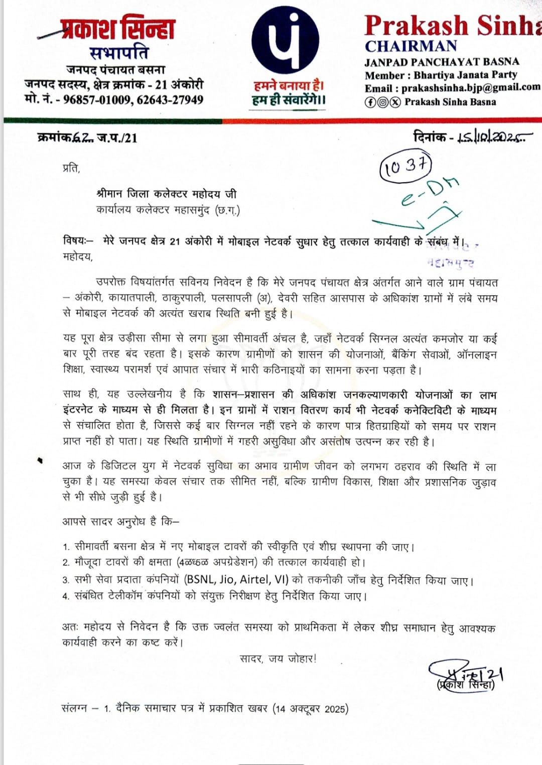 बसना/महासमुंद। जनपद पंचायत बसना क्षेत्र के अंतर्गत आने वाले कई गाँवों में पिछले कई महीनों से गंभीर नेटवर्क समस्या गहरा गई है, जिससे यहाँ का जनजीवन और शासकीय कामकाज बुरी तरह प्रभावित हो रहा है। इस गंभीर समस्या को लेकर क्षेत्र क्रमांक 21 अंकोरी के जनपद सदस्य एवं जनपद सभापति प्रकाश सिन्हा ने महासमुंद जिला कलेक्टर श्री विनय कुमार लंगेह को एक विस्तृत ज्ञापन सौंपा, जिस पर कलेक्टर ने तत्काल संज्ञान लेते हुए त्वरित जाँच के निर्देश जारी कर दिए हैं।
