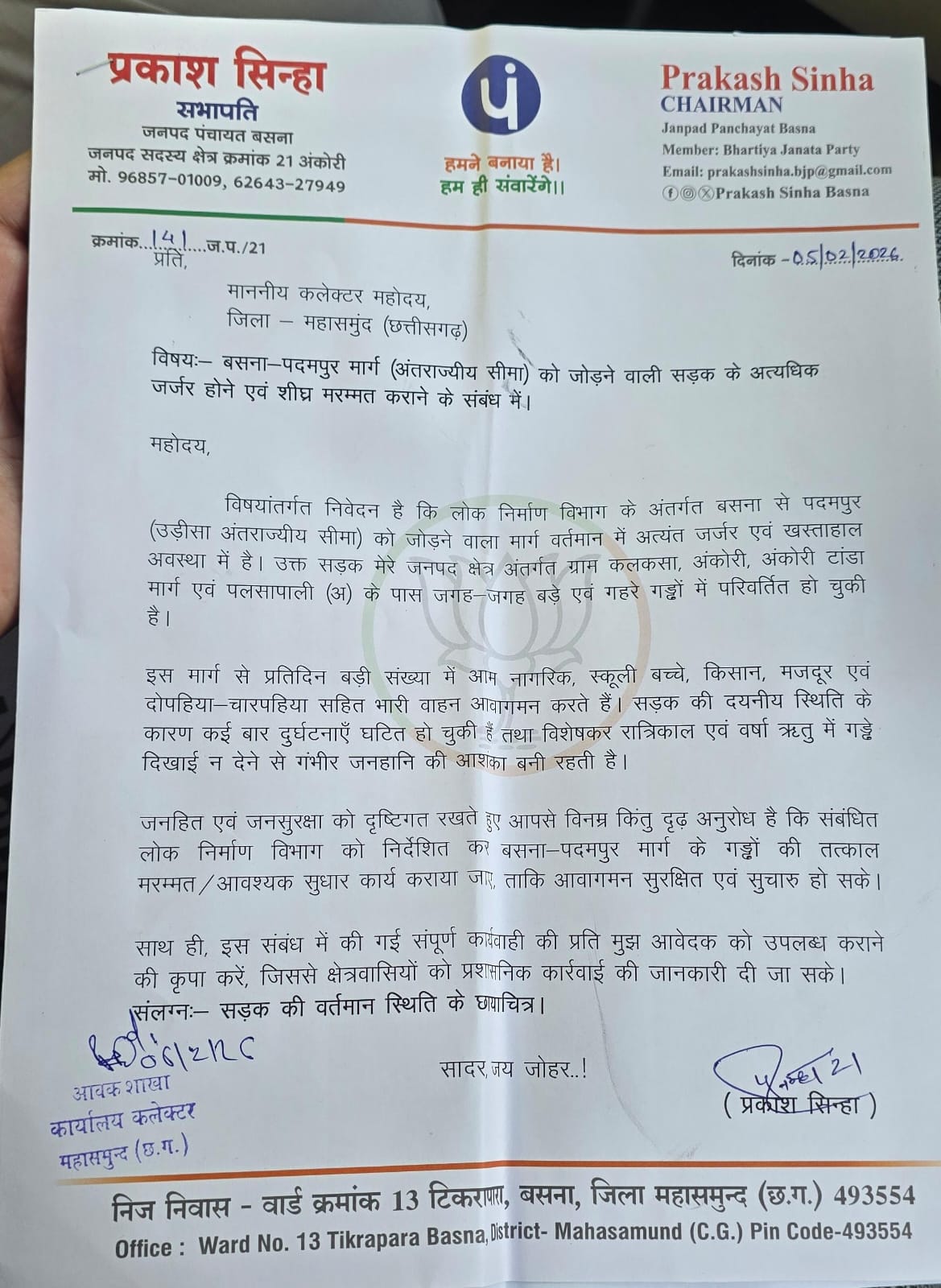 प्रकाश सिन्हा ने कलेक्टर महासमुंद को 06 फरवरी को पत्र लिखकर आग्रह किया है कि संबंधित लोक निर्माण विभाग को निर्देशित कर गड्ढों की तत्काल मरम्मत अथवा आवश्यक सुधार कार्य कराया जाए, ताकि आवागमन सुरक्षित एवं सुचारु हो सके। साथ ही उन्होंने प्रशासन से संबंधित कार्य एजेंसी के विरुद्ध शीघ्र कार्रवाई करने की भी मांग की है, जिससे भविष्य में इस प्रकार की लापरवाही की पुनरावृत्ति न हो।